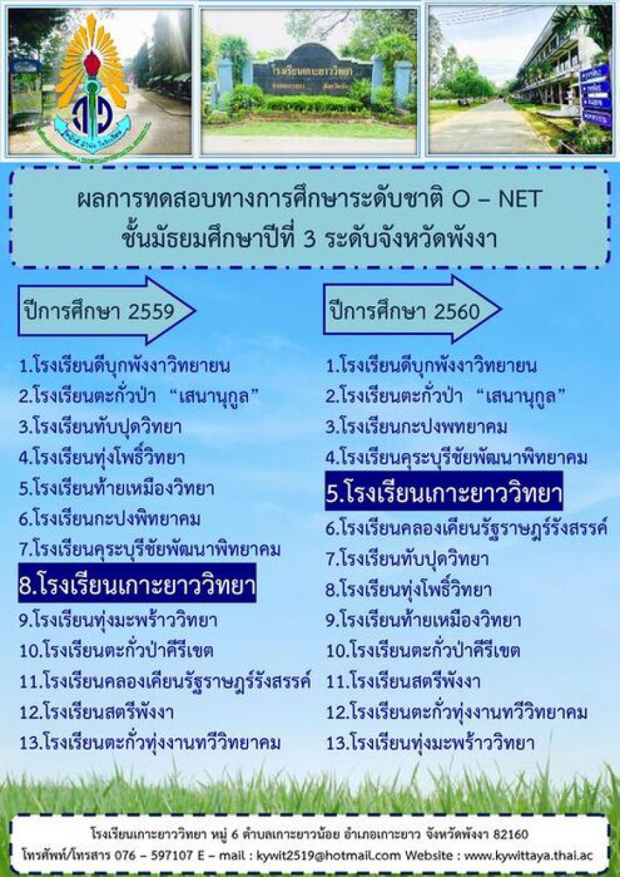 โรงเรียนเกาะยาววิทยา มีผลการทดสอบทางการศึกษาระดับชาติ O - NET ม.3 อยู่ในลำดับที่ 5 จาก 13 โรงเรียนในจังหวัดพังงา S:0