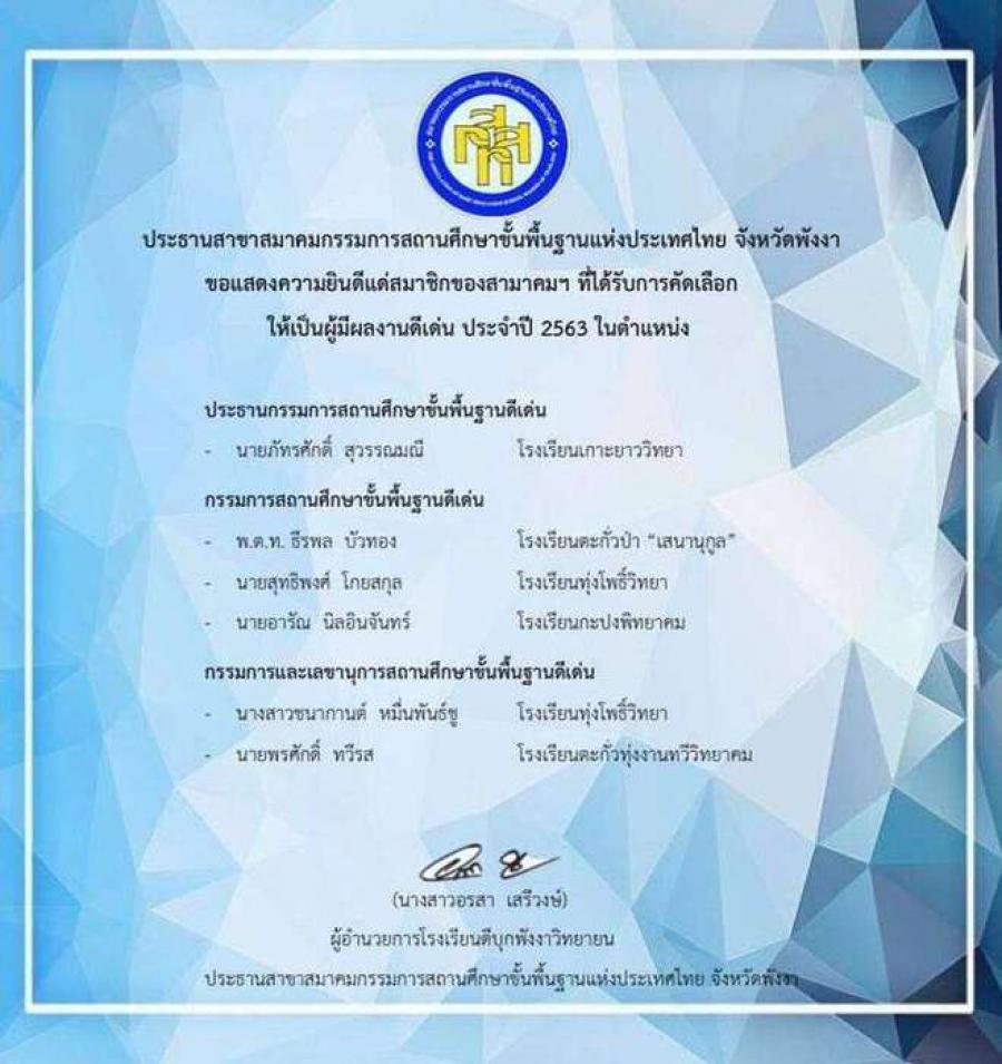 โรงเรียนเกาะยาววิทยาขอแสดงความยินดีกับคุณภัทรศักดิ์ สุวรรณมณี ที่ได้รับการคัดเลือกให้เป็นผู้มีผลงานดีเด่น ปะจำปี 2563 ในตำแหน่ง ประธานคณะกรรมการสถานศึกษาขั้นพื้นฐาน จากสมาคมคณะกรรมการสถานศึกษาขั้นพื้นฐานแห่งประเทศไทย จังหวัดพังงา S:0