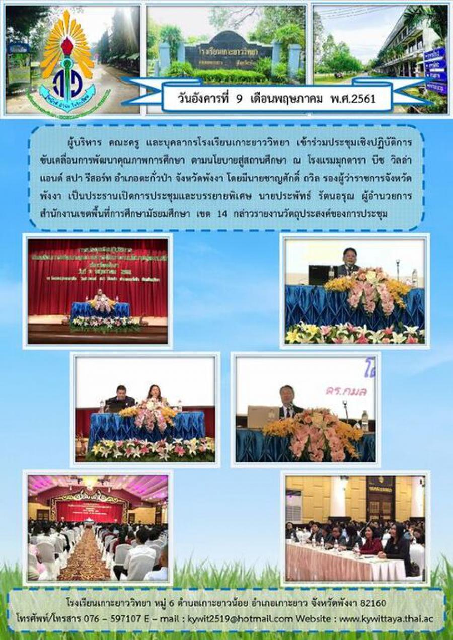 ผู้บริหาร คณะครู และบุคลากรโรงเรียนเกาะยาววิทยา เข้าร่วมประชุมเชิงปฏิบัติการขับเคลื่อนการพัฒนาคุณภาพการศึกษา ตามนโยบายสู่สถานศึกษา ณ โรงแรมมุกดารา บีช วิลล่า แอนด์ สปา รีสอร์ท อำเภอตะกั่วป่า จังหวัดพังงา โดยมีนายชาญศักดิ์ ถวิล รองผู้ว่าราชการจังหวัดพังงา เป็นประธานเปิดการประชุมและบรรยายพิเศษ นายประพัทธ์ รัตนอรุณ ผู้อำนวยการสำนักงานเขตพื้นที่การศึกษามัธยมศึกษา เขต 14 กล่าวรายงานวัตถุประสงค์ของการประชุม S:0