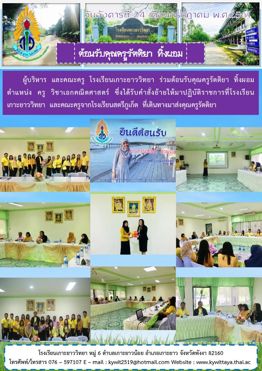 ผู้บริหาร และคณะครู โรงเรียนเกาะยาววิทยา ร่วมต้อนรับคุณครูรัตติยา ทิ้งผอม ตำแหน่ง ครู วิชาเอกคณิตศาสตร์ ซึ่งได้รับคำสั่งย้ายให้มาปฏิบัติราชการที่โรงเรียน เกาะยาววิทยา และคณะครูจากโรงเรียนสตรีภูเก็ต ที่เดินทางมาส่งคุณครูรัตติยา S:0