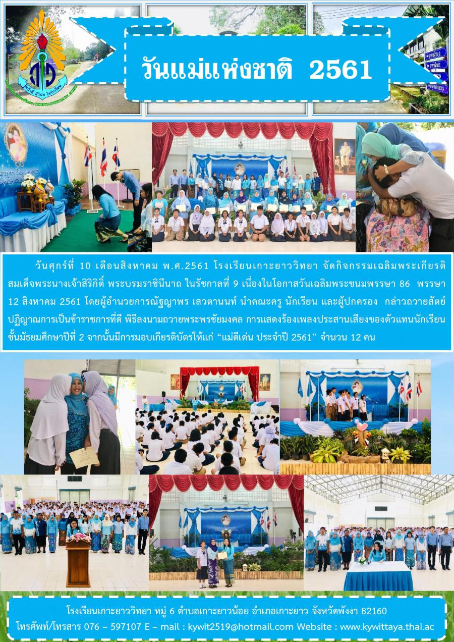 วันศุกร์ที่ 10 เดือนสิงหาคม พ.ศ.2561 โรงเรียนเกาะยาววิทยา จัดกิจกรรมเฉลิมพระเกียรติ สมเด็จพระนางเจ้าสิริกิติ์ พระบรมราชินีนาถ ในรัชกาลที่ 9 เนื่องในโอกาสวันเฉลิมพระชนมพรรษา 86 พรรษา 12 สิงหาคม 2561 โดยผู้อำนวยการณัฐญาพร เสวตานนท์ นำคณะครู นักเรียน และผู้ปกครอง กล่าวถวายสัตย์ปฏิญาณการเป็นข้าราชการที่ดี พิธีลงนามถวายพระพรชัยมงคล การแสดงร้องเพลงประสานเสียงของตัวแทนนักเรียน ชั้นมัธยมศึกษาปีที่ 2 จากนั้นมีการมอบเกียรติบัตรให้แก่ ?แม่ดีเด่น ประจำปี 2561? จำนวน 12 คน S:0