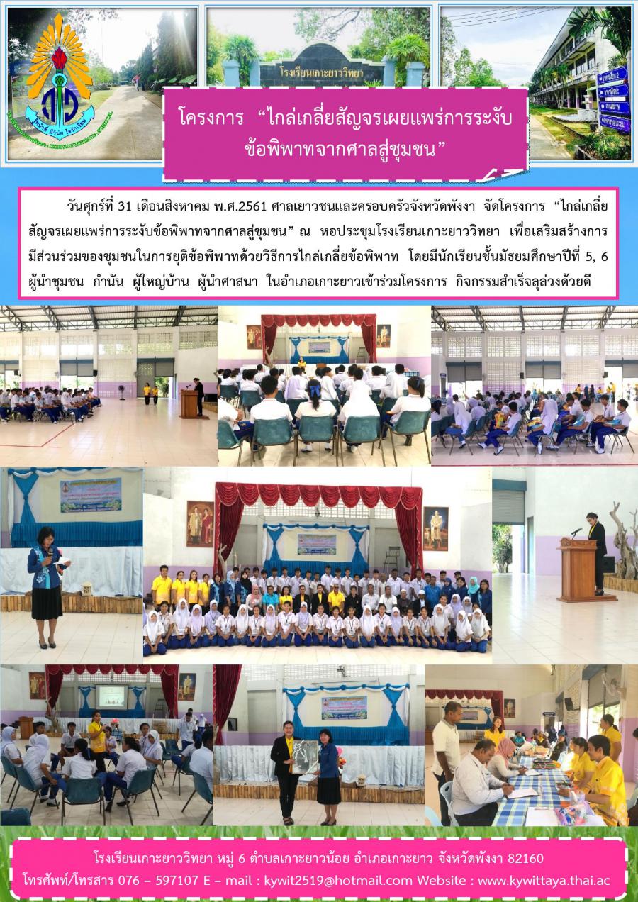 วันศุกร์ที่ 31 เดือนสิงหาคม พ.ศ.2561 ศาลเยาวชนและครอบครัวจังหวัดพังงา จัดโครงการ ?ไกล่เกลี่ยสัญจรเผยแพร่การระงับข้อพิพาทจากศาลสู่ชุมชน? ณ หอประชุมโรงเรียนเกาะยาววิทยา เพื่อเสริมสร้างการ มีส่วนร่วมของชุมชนในการยุติข้อพิพาทด้วยวิธีการไกล่เกลี่ยข้อพิพาท โดยมีนักเรียนชั้นมัธยมศึกษาปีที่ 5, 6 ผู้นำชุมชน กำนัน ผู้ใหญ่บ้าน ผู้นำศาสนา ในอำเภอเกาะยาวเข้าร่วมโครงการ กิจกรรมสำเร็จลุล่วงด้วยดี S:0